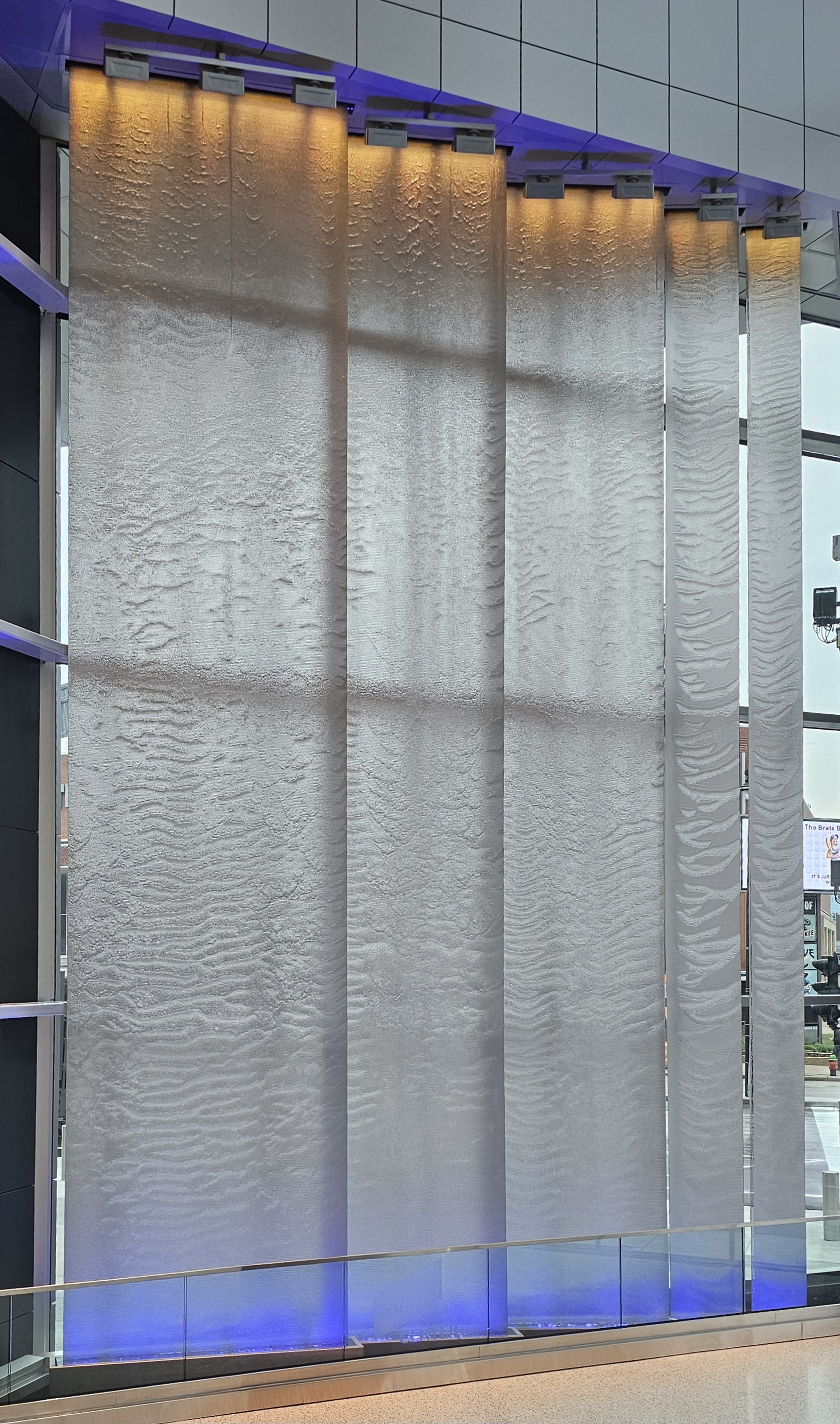The Great Five incorporates the beauty and majesty of the Great Lakes into this vibrant water feature. The piece consists of 5 panels made from steel mesh, each representing one of the great lakes. Water is then run down the panels, caught in collection basins and recycled back through the piece for a continuous flow of liquid.