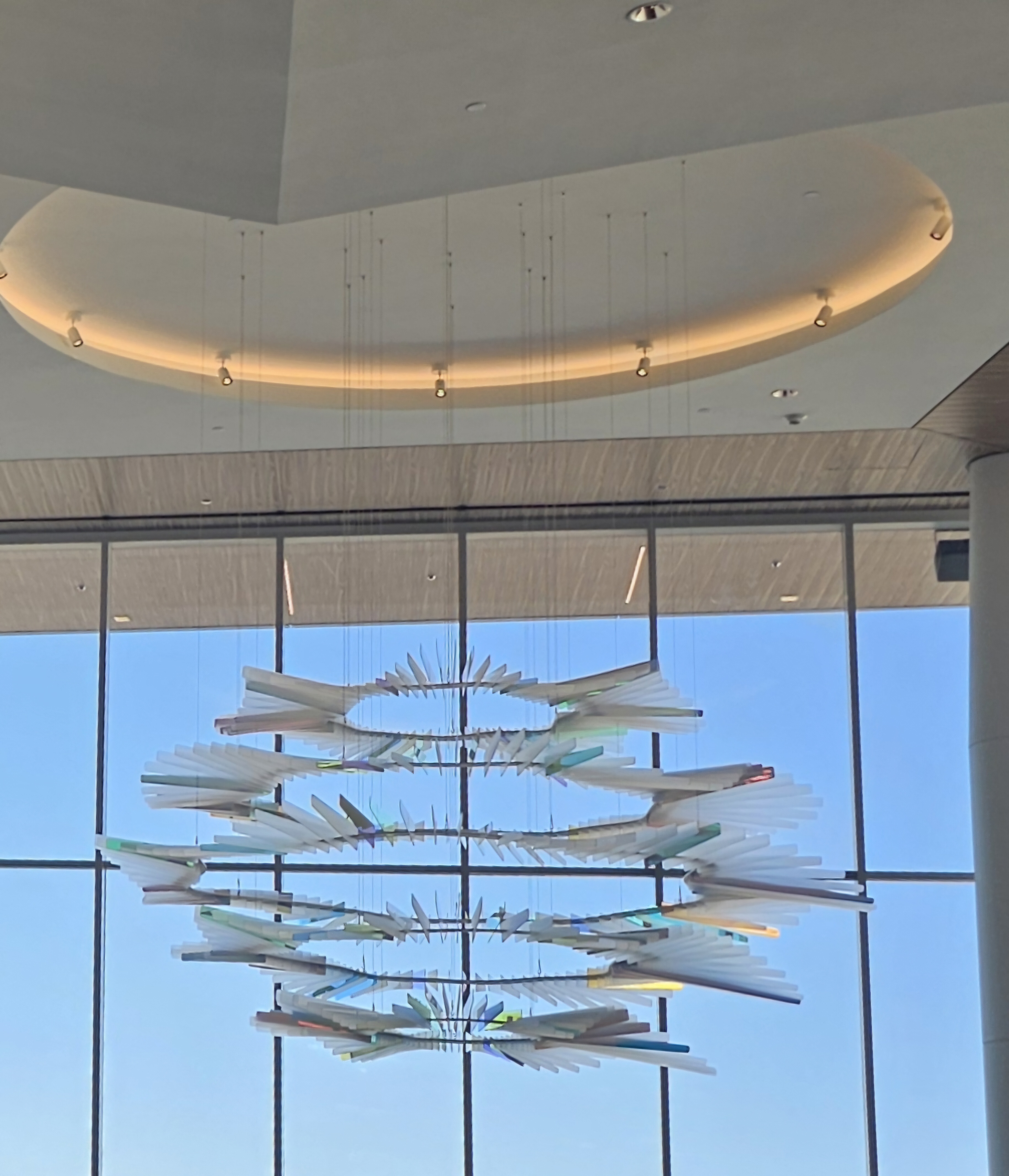 “There is all of this glass around the piece,” Tuan says. “So, we thought about how there needed to be vibrant colors to reflect the light. That is why we incorporated a lot of color into the fins. On a good spring or fall day with a low sun, this piece is really going to pop and liven up the space a lot.”