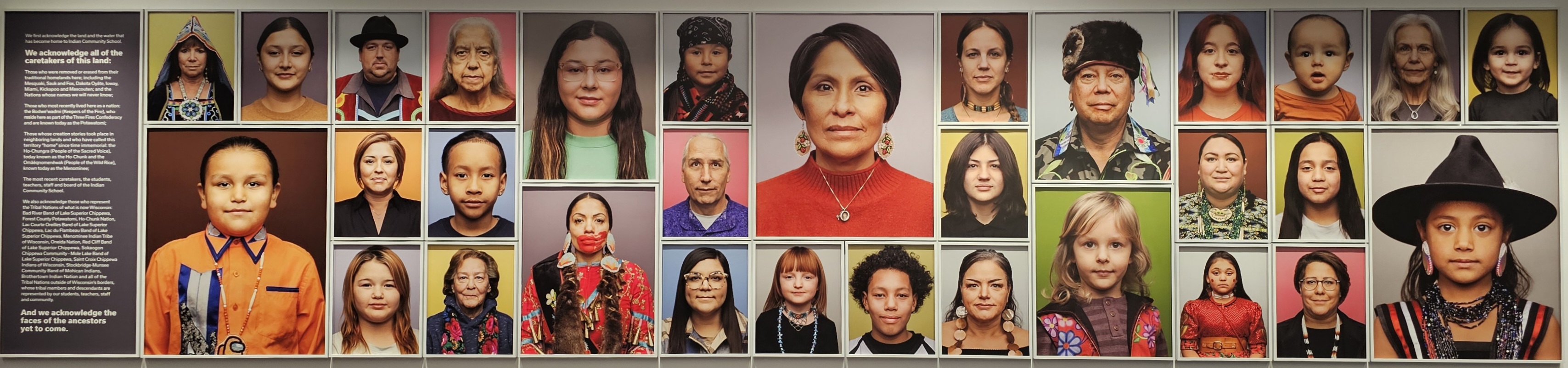 Acknowledgment contains portraits of members of the Native American community in Milwaukee, creating a visual acknowledgment of people and place. Baird Center sits on land that was the traditional home of Potawatomi, Ho-Chunk and Menominee peoples. Members of these and other Tribal Nations are represented in the portraits.