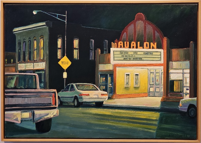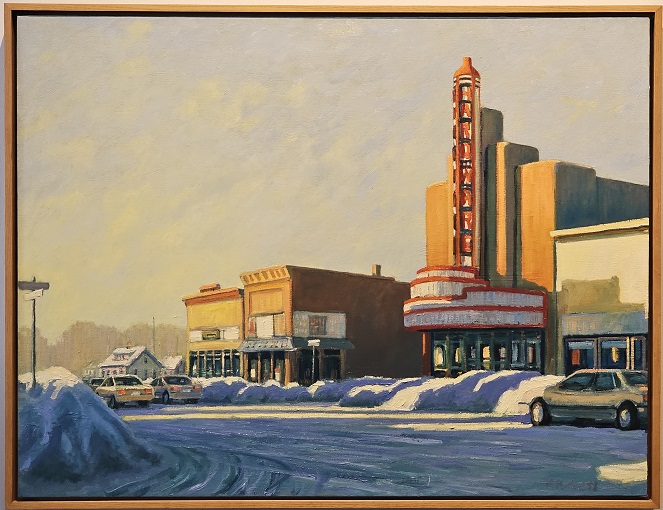 The painting is loosely based upon a hardware store in Superior, WI that used to be the Superior movie theatre. After being vacant for years, it was converted to a hardware store. Growing up as a child the artist would travel into Superior and Duluth for “big city” adventures and one of these days served as the model for the piece.