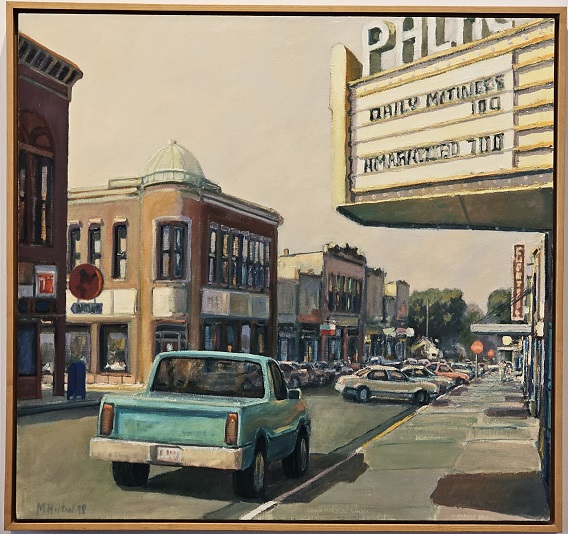 The artist uses a movie theater marquee based upon his love of movies as a child. Growing up, his older brother would often take him to a movie when babysitting his younger sibling and the scene he created is patterned off one of those days. The town is set on a hot summer day and when combined with the pickup truck and theater almost becomes a moment in time.