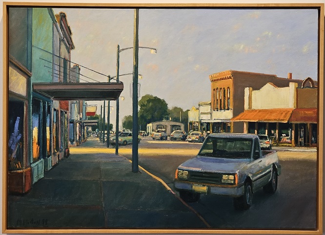The artist loosely based the painting on Winner, SD. But the work is representative of many small farming towns in Wisconsin. These towns are often like living museums that show a simpler time. The sun is low and warm and represents the warmth of many farming communities throughout the United States.