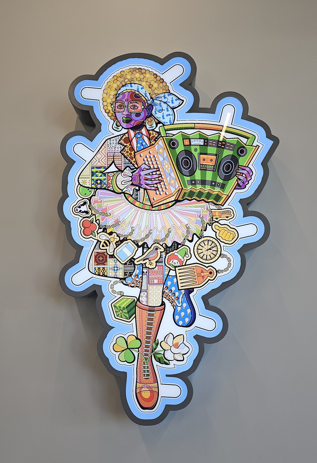 7. Accordion: bellows- boombox representing hip hop culture.