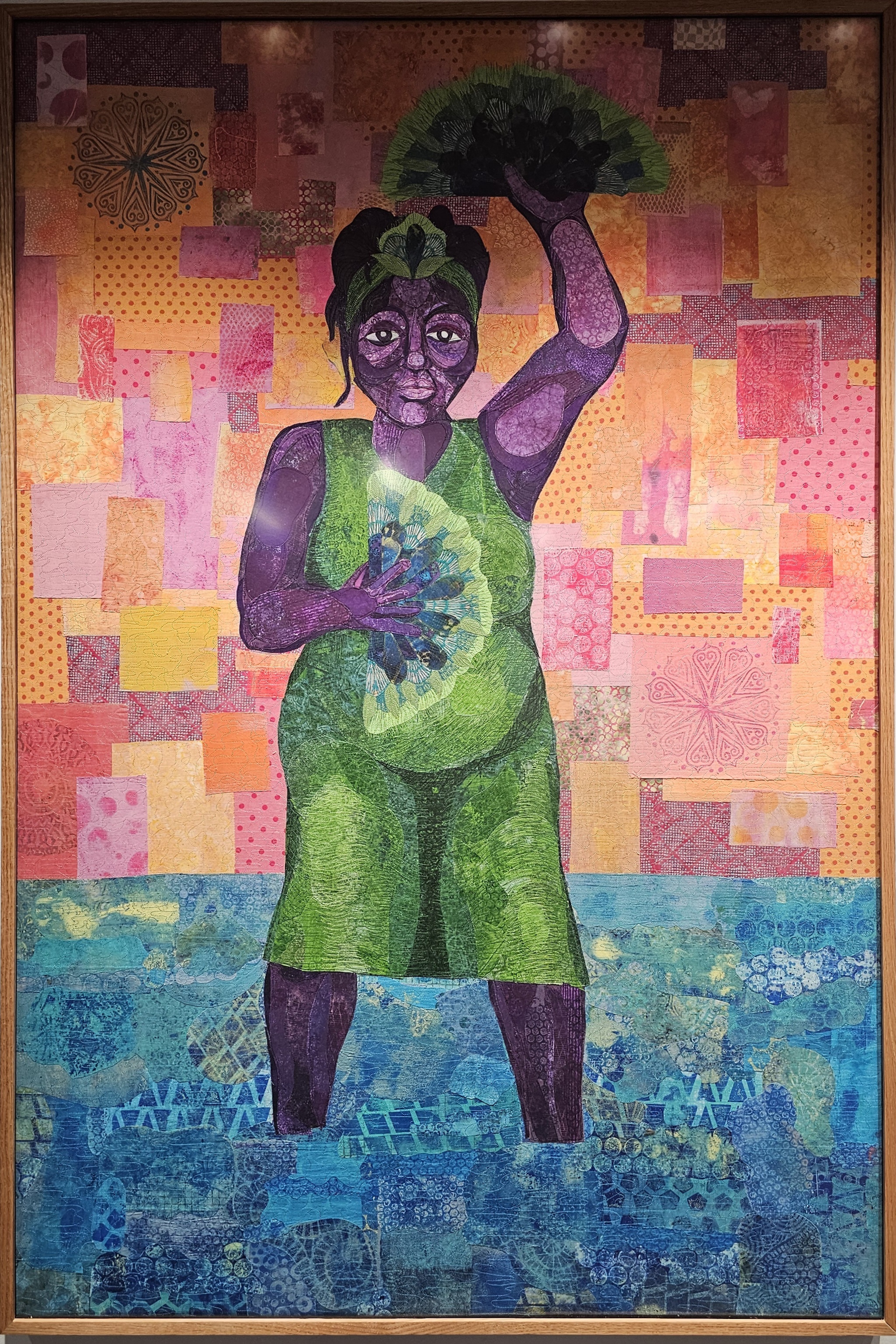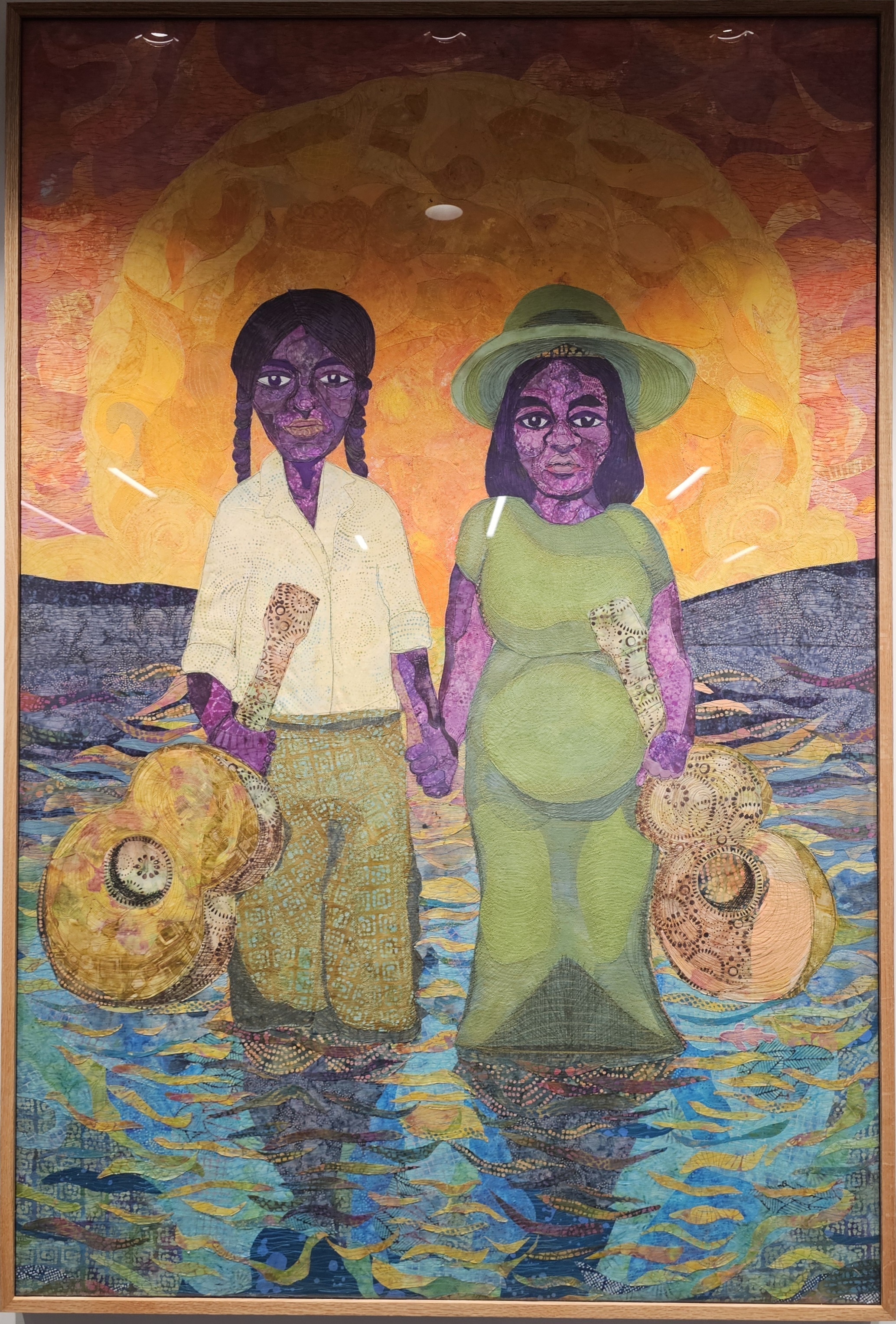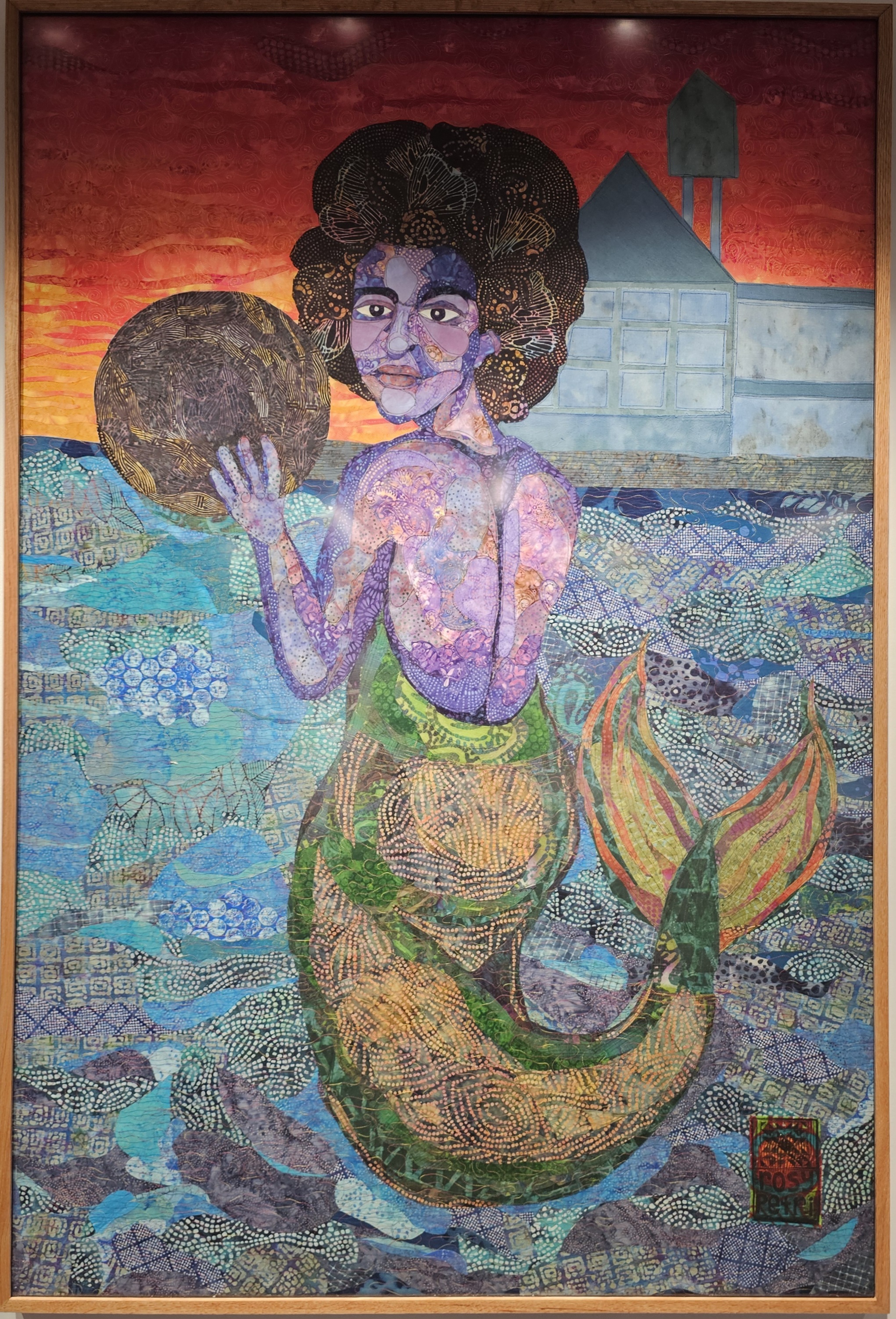 This final piece in the series closes out the tale of the Great Migration as it became clear that the equality sought in the North would not be found. Yet it also portrays the hope that one day equality can be achieved. The water spirit is pictured in the waters near Grafton holding one of the master recordings from a Paramount Records blues artist. This signifies the sadness in the loss of these master works but also the hope that, “a black mermaid gathered them up and took them over to wherever over is for us.” These recordings are foundational for establishing the impact of diaspora musicians, especially queer Black Women, changing the face of the American soundscape. The spirit of the water is a part of diasporan spirituality and allows us to store our hopes in an untouchable spiritual realm where they cannot be destroyed.