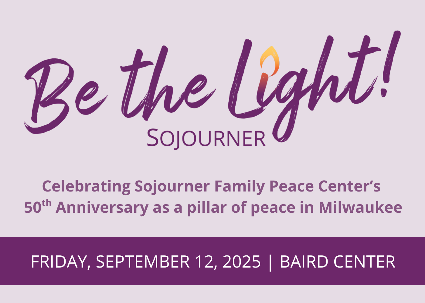 Sojourner Family Peace Center’s Be the Light gala celebrates survivors of domestic violence while raising crucial funds for their transformative work. This year is particularly meaningful as we celebrate Sojourner’s 50th Anniversary as a pillar of peace in Milwaukee. Be the Light 2025, held on September 12th, will feature a social reception, dinner, live auction, and mission moments showcasing Sojourner’s impact. Donald Driver will serve as Honorary Co-Chair, and the evening will conclude with an Afterglow Celebration, including dessert and dancing with DJ Shawna. Be the Light is both a celebration and a vital fundraiser that supports the 10,000 survivors Sojourner serves annually.